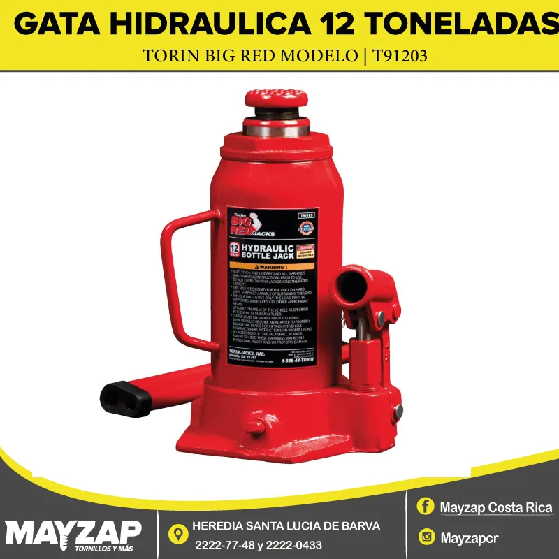 La gata hidráulica botella de 12 toneladas es robusta y eficiente. ideal para trabajos pesados en talleres. Su diseño asegura un levante seguro.