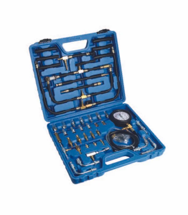 Probador de presión de bomba de combustible con retorno 36 piezas. Herramienta completa para verificar presión y retorno.